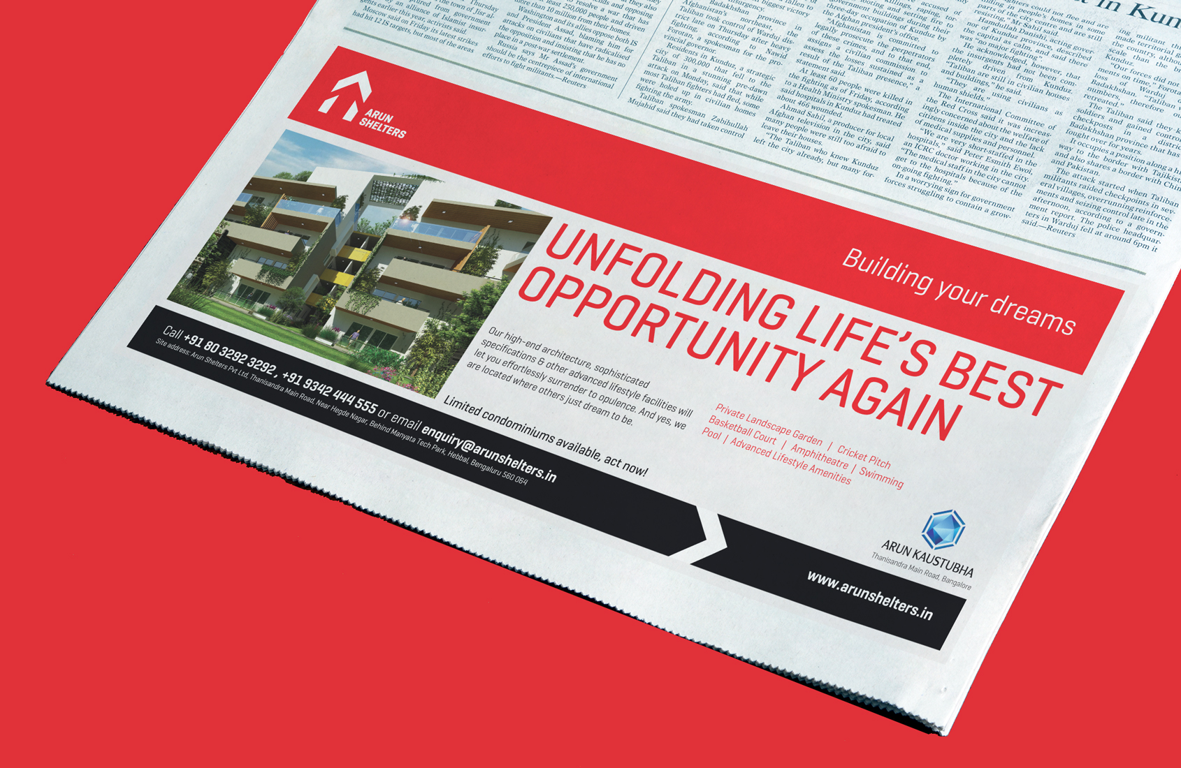To create a unique brand identity for Bangalore-based real estate brand Arun Shelters. Arun Shelters has been in the Bangalore real estate industry for more than a decade. Their portfolio spans more than 40-50 acres of land bank in North Bangalore. Their aim was to establish themselves as a strong contender in the competitive real estate market. They also had huge plans of aggressive growth in the next 3-5 years and they wanted their logo to depict growth.