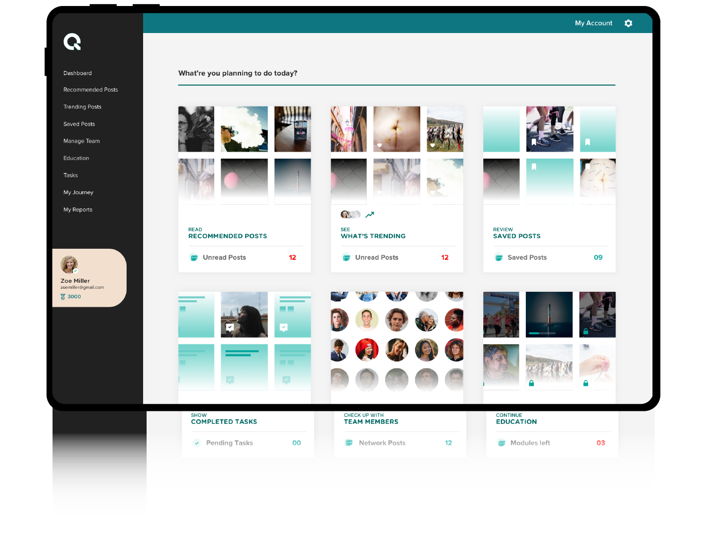 All existing content become a part of three modules. These not only promote articles and videos but also suggest surveys and questionnaires that the user can participate in, right from the dashboard.